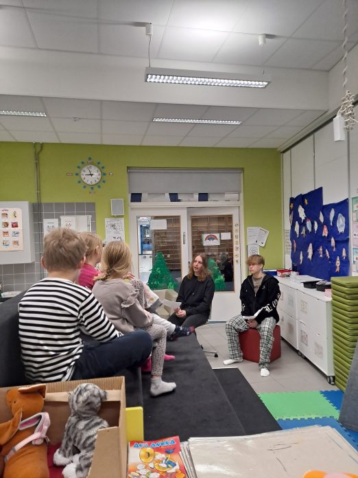 “Lapset vaikuttivat alkuun aika ujoilta ja hermostuneilta. Kun sitten esittäydyimme ja aloin kertomaan tarinaani, he vaikuttivat paljon leppoisemmilta ja kuuntelivat aivan rauhassa. Vaikka välillä lasten ajatukset vaikuttivat olevan vähän muualla, kyselyn jälkeen huomasi, että tarina oli sisäistetty hyvin.”