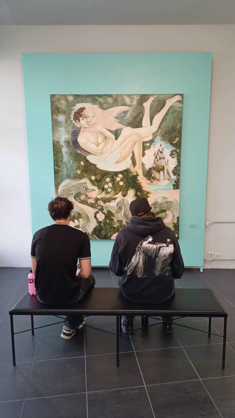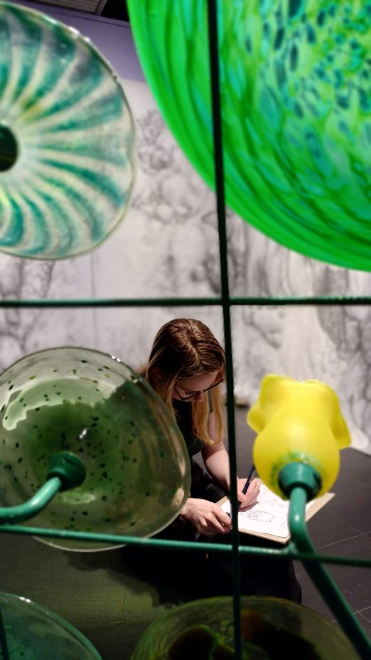 Opiskelijoiden tehtävänä museovierailulla oli katsella teoksia, tutustua niistä yhteen tarkemmin ja piirtää kuva joko koko teoksesta tai sen kiinnostavimmasta yksityiskohdasta. Melkein kaikki valitsivat eri teoksen ja kaikista saattoi aistia innostusta ja keskittymistä, vaikka kello lähenteli jo puoli viittä.