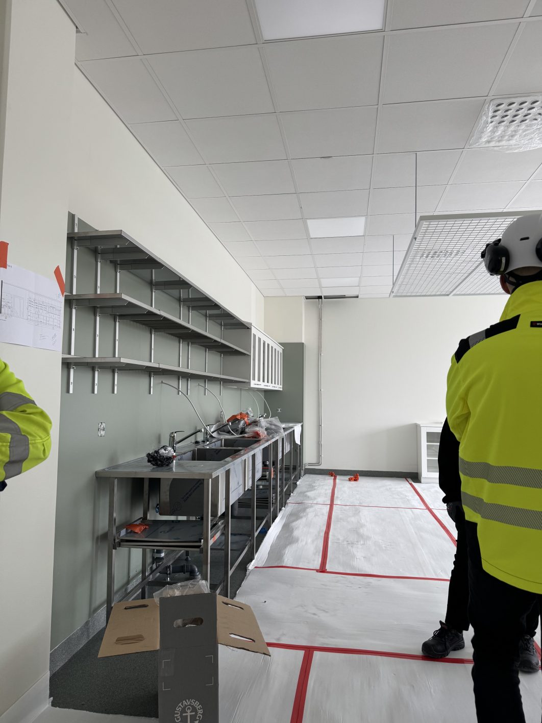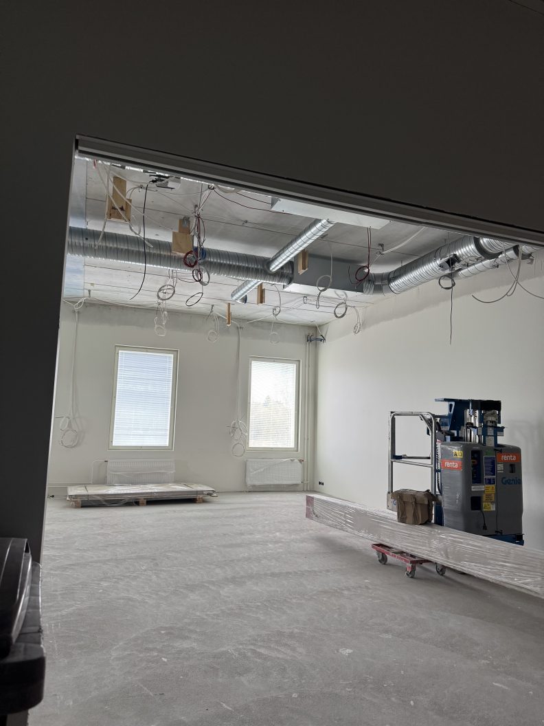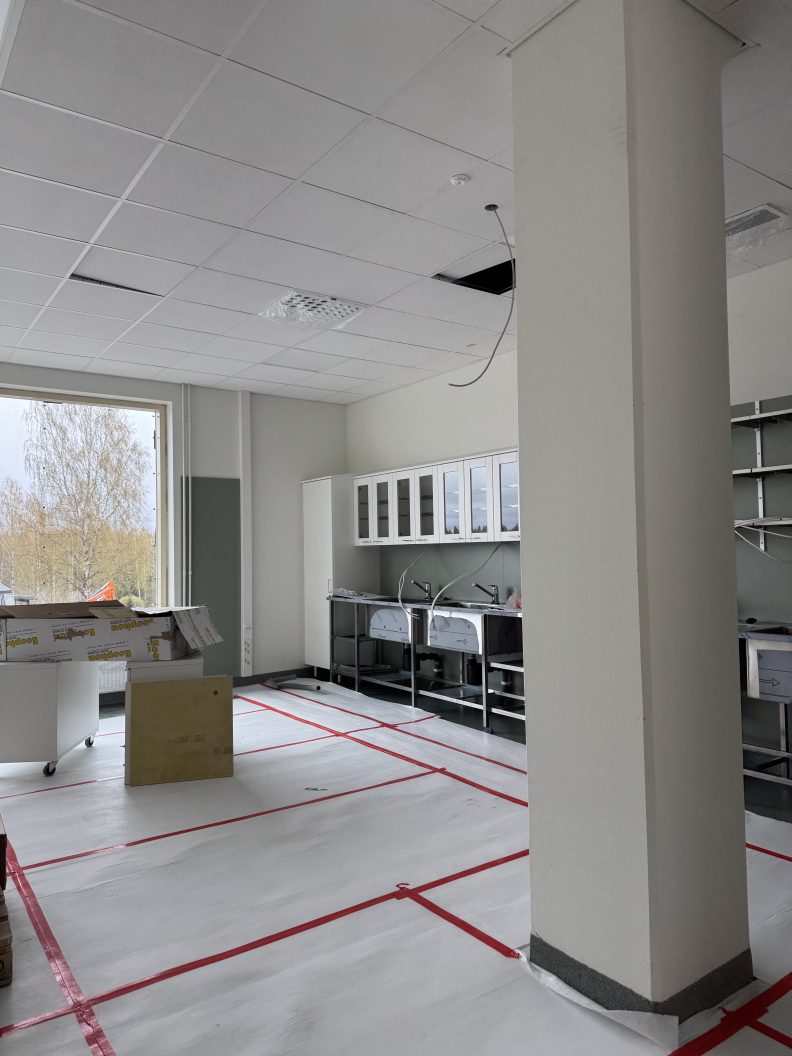 Osa luokkahuoneista, kuten kuvissa esiintyvä tuleva kuvaamataidon luokka on saanut jo lavuaarit sekä hyllyt! Myös upeat seinävärit ja pintamateriaalit olivat jo nähtävissä.