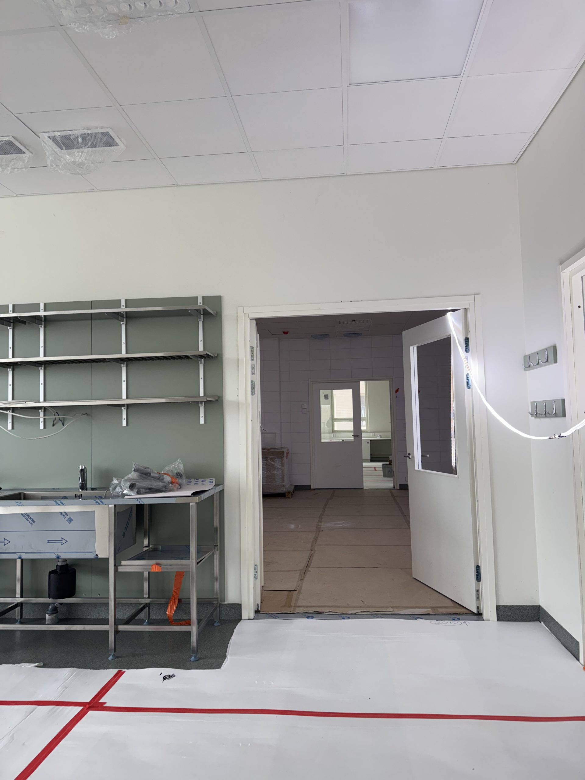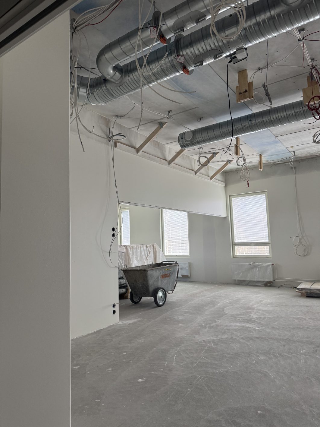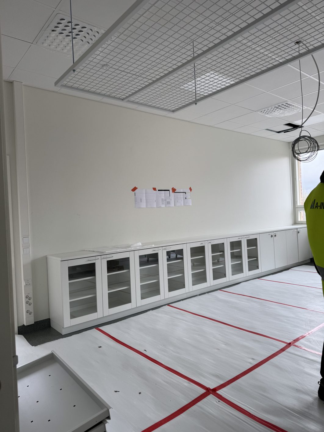 Osa luokkahuoneista, kuten kuvissa esiintyvä tuleva kuvaamataidon luokka on saanut jo lavuaarit sekä hyllyt! Myös upeat seinävärit ja pintamateriaalit olivat jo nähtävissä.