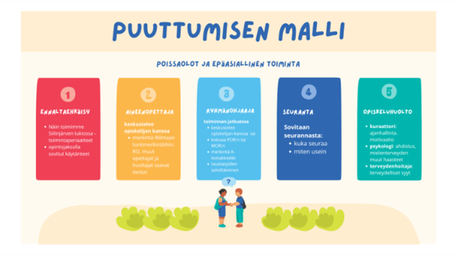 Opetukseen osallistumista seurataan ja poissaolot kirjataan välittömästi. Opintojen etenemiseen liittyviin huoliin ja poissaoloihin puututaan ennaltaehkäisevästi.